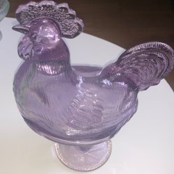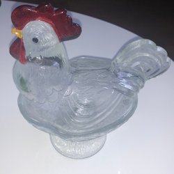Denna tuppfigur är tillverkad av keramik och har en detaljerad design. Figuren är målad i flera färger, inklusive rött för kammen, vitt och blått för kroppen, och grönt för stjärtfjädrarna. Den står på en brun bas och har synliga fötter. En öppning finns på undersidan