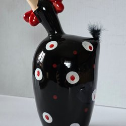 Tuppen är gjord i keramik med någon form av glasyr som gör den blank. Den är i tillverkningsskick, utan skador.