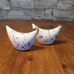 Två charmiga hönor med ägg som påskpynt. En höna är grön och den andra är lila. Äggen har prickar i samma färg som hönan.mått höjd 8cm