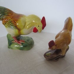 Två olika stora hönor,med hål där bak för ev ha blommor eller servetter i. Måtten är på den stora H20, B13, L12 och den andra är H12,B7,L10 cm.