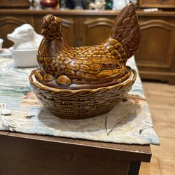 En vit keramikhöna med röda och gula detaljer. Hönsen är ihålig och består av två delar, en undre del och en övre del som fungerar som lock. Den är 22 cm lång och 14 cm hög.