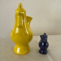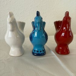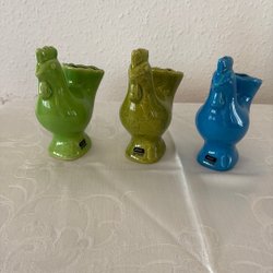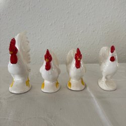 Fyra tuppar i keramik. Tupparna är i olika storlekar och färger.