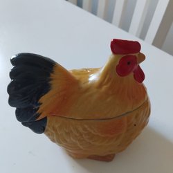 En keramikhöna i färgerna brun, gul och grön. Hönsen är avtagbar från basen.