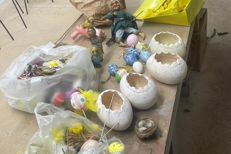 Ett sortiment av påskdekorationer. Inkluderar figurer, ägg och andra diverse dekorationer.