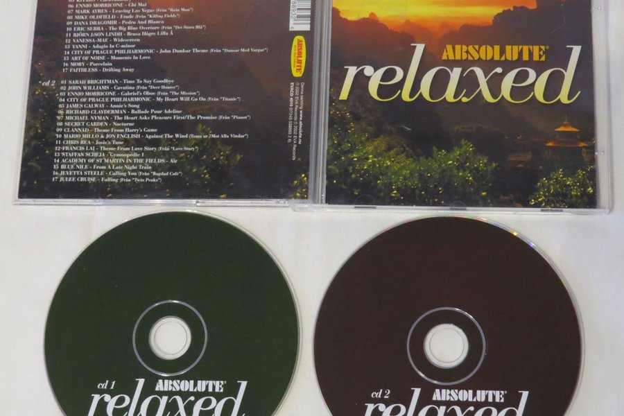 Dubbel-CD med Absolute Relaxed. Denna samling innehåller lugna och avkopplande låtar från artister som Enigma, Ennio Morricone, Sarah Brightman och många fler. Perfekt för avkoppling och lugna stunder.