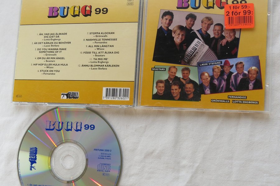 CD-skivan "Bugg 99" innehåller följande låtar: 1. "Åh, vad jag älskade dig just då" - Lotta Engbergs 2. "Är det kärlek du behöver" - Lasse Stefanz 3. "Do you wanna make something of it" - Grönwalls 4. "Om du är min ängel" - Seastars 5. "Hip hop eller hula hula" - Wizex 6. "Stuck on you" - Fernandoz 7. "Stoppa klockan" - Grönwalls 8. "Nashville Tennessee" - Fernandoz 9. "All min längtan" - Wizex 10. "Född till att älska dig" - Seastars 11. "Ta mig me'" - Lotta Engbergs 12. "Ännu blommar kärleken" - Lasse Stefanz