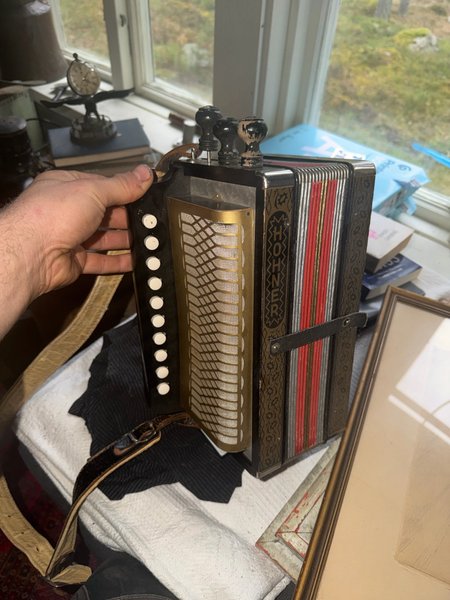 Fungerande dragspel i D dur. Kan behöva en översikt, lätt glapp i en av de vänstra väntilerna. Annars håller den tätt.