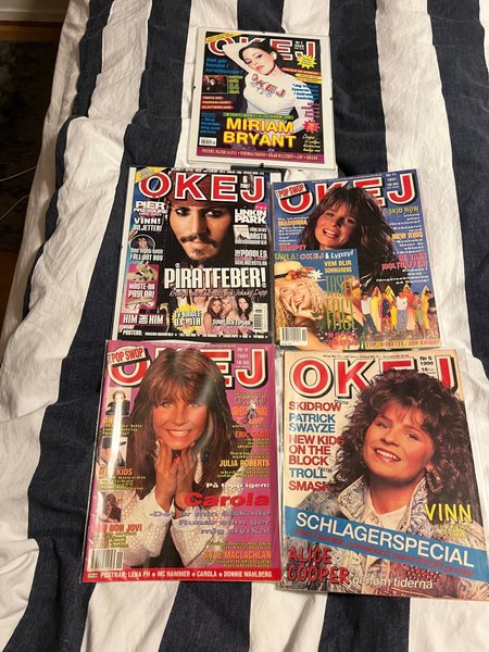 Fem OKEJ tidningar med olika artister och teman. En tidning från 2025 med Miriam Bryant på omslaget. En tidning från 2007 med Johnny Depp på omslaget. Två tidningar från 1991 med Carola och Skid Row på omslagen. En tidning från 1990 med Carola på omslaget.