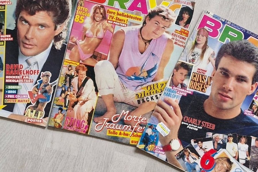 Tre Bravo tidningar med David Hasselhoff, Charly Steeb och andra kändisar på omslagen. Tidningarna innehåller affischer och artiklar om musik och TV-stjärnor.