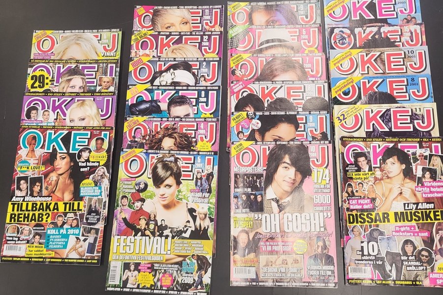 OKEJ tidningar från 2003, 2005, 2008 och 2009. Tidningarna innehåller artiklar om musik, mode och kändisar.
