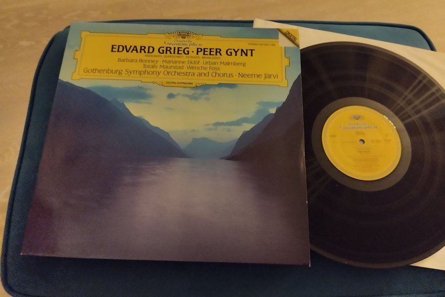 LP-skiva med Edvard Griegs Peer Gynt, framförd av Göteborgs symfoniorkester och kör under ledning av Neeme Järvi, med solisterna Barbara Bonney, Marianne Eklöf, Urban Malmberg, Toralv Maurstad och Wenche Foss.