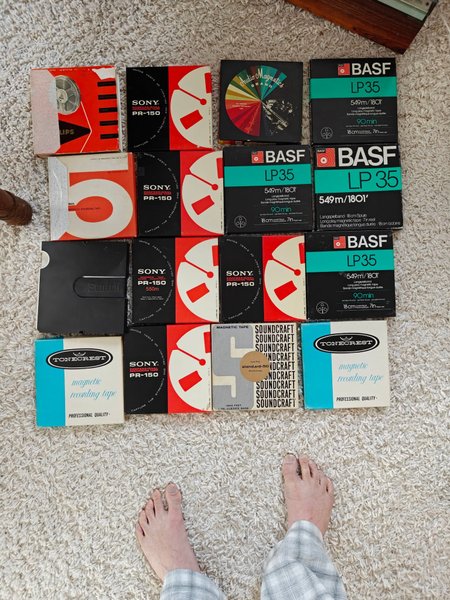 Ett sortiment av diverse rullband från märken som BASF, Sony, Philips, Tonecrest, Audio Magnetics och Soundcraft. Banden har olika längder och typer.
