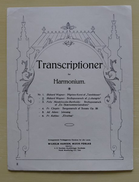 Brölloppsmarsch. Wilhelm Hansen 1949. Wagners berömda tema ur "Lohengrin", arrangerat för orgelharmonium eller piano.