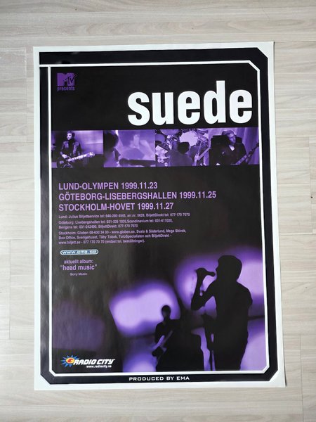 Affisch med Suede som annonserar konserter i Lund, Göteborg och Stockholm i november 1999. Affischen nämner även bandets album "Head Music" och är producerad av EMA.