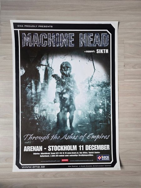 Affisch för Machine Head konsert med support av Sikth. Konserten ägde rum på Arenan i Stockholm den 11 december. Affischen annonserar biljetter via BiljettDirekt Ticnet och andra försäljningsställen. Information om bandet finns på machinehead1.com och roadrunnerrecords.co.uk. Evenemanget presenterades av EMA och EMA Telstar, ett Clear Channel Entertainment Company.