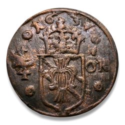 Ett antikt kopparmynt med årtal och värde präglat. Se bilder för detaljer.