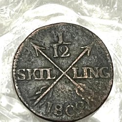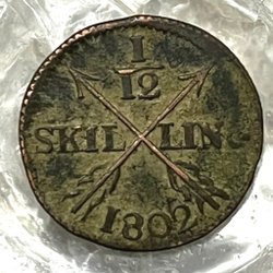 Ett 1/12 Skilling mynt präglat 1802. Värdet 1/12 skilling är tydligt markerat på myntet.