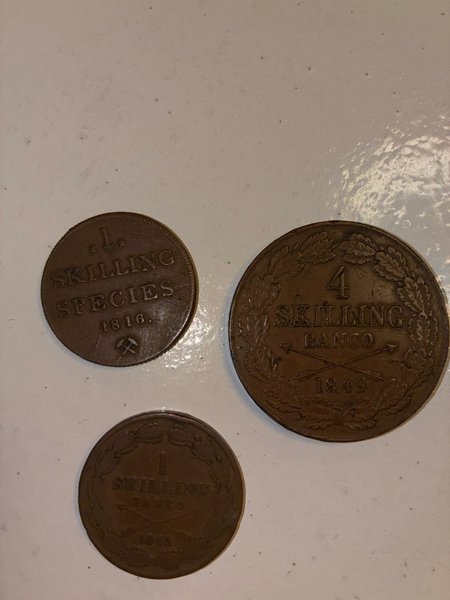 Samling av äldre mynt. Inkluderar ett mynt från 1816 märkt ”1 Skilling Species” och 1 mynt från 1849 märkt 4 Skilling Banco, ett mynt 1845 märkt 1 skilling banco