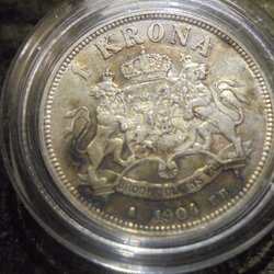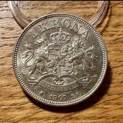 En fin 1 krona från 1876 med Oscar II porträtt.