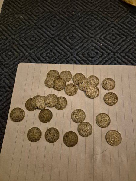 En samling av äldre svenska mynt. Inkluderar 25 öre från åren 1898, 1899, 1901, 1902, 1904, 1905, 1906 och 1907. Samt ett mynt från 1967.