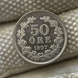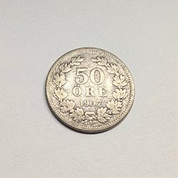 Detta är en 50 öre från Sverige, präglad år 1907. Framsidan visar valören ”50 ÖRE 1907” omgiven av en krans. Baksidan har texten ”SVERIGES VAL” och en krönt monogram.