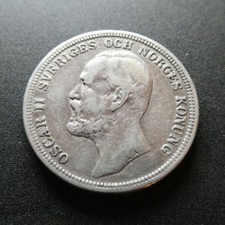 Detta är en 2 Kronor från Sverige, präglad 1876. Framsidan visar Oscar II, Sveriges och Norges Konung. Baksidan visar Sveriges riksvapen med texten "BRODR FOLKENS VÄL".