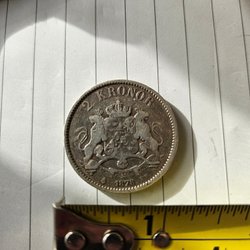 Detta är en 2 Kronors mynt från 1878. Myntet har texten "OSCAR II NORGES O. SVER. KONGE BRODERFOLKENES VEL" på ena sidan och "2 KRONER 1878" på den andra sidan.