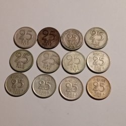 En samling av svenska mynt. Inkluderar mynt från olika årtal och valörer.1kronor 12 st.Från 1940 talet till mitten av 60 talet.Köpare bet porto.