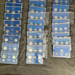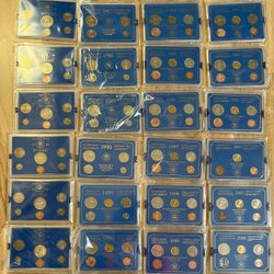 Ett komplett myntset från Sverige. Inkluderar 1 krona, 2 kronor, 50 öre, 25 öre, 10 öre, 2 öre och 1 öre. Alla mynt är från 1947 och präglade vid Kungliga Mynt Stockholm.