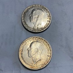 Silvermynt präglat med Gustaf V:s porträtt.
