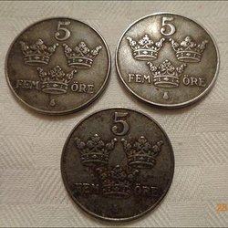 Samling med tre äldre mynt. Ett 2 Kronor mynt från 1904 med Oscar II, från Sverige och Norge. Ett 1 Krona mynt från 1943 med Gustaf V, från Sverige. Ett 50 Öre mynt från 1940, från Sverige.