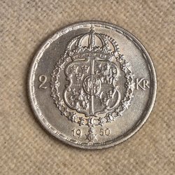 Ett svenskt mynt från 1950 med ett värde av 2 kr.