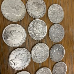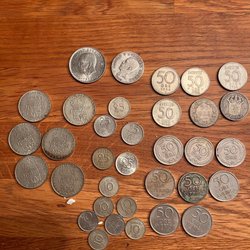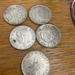 Parti med svenska mynt. Mynten är i järn. . Valörerna är 5 öre.106 st.