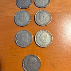Tre svenska mynt. Ett mynt från 1927 med valören 50 öre. Två mynt från 1940 med valören en krona.