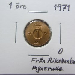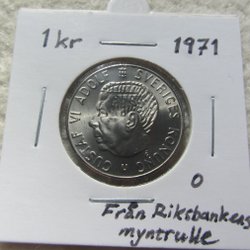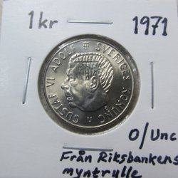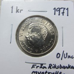2 kronor, 1971, helt ocirkulerad, kvalitet 0 / Unc. Tonat ex, syns inte så bra på bilderna men skimrar lätt i blått. Vackert exemplar!