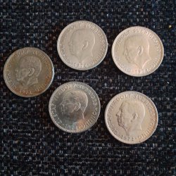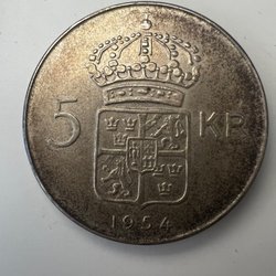 Ett svenskt silvermynt präglat 1954 med valören 5 kronor.