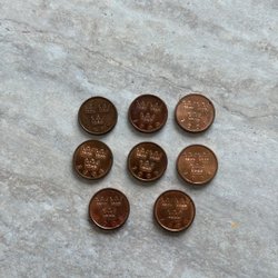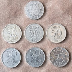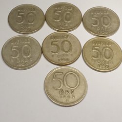8 stycken svenska 50 öre. Årtalen inkluderar 1954, 1955, 1956, 1957, 1961 och 1972. Valören är 50 öre.