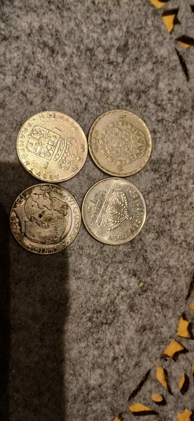 Fyra svenska mynt. Ett mynt från 1973 med texten "FRAMFÖR ALLT". Ett mynt från 1949. Ett mynt med texten "CARL XVI GUSTAF SVERIGE". Ett mynt med texten "EN KRONA" och "FÖR SVERIGE I TIDEN".