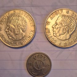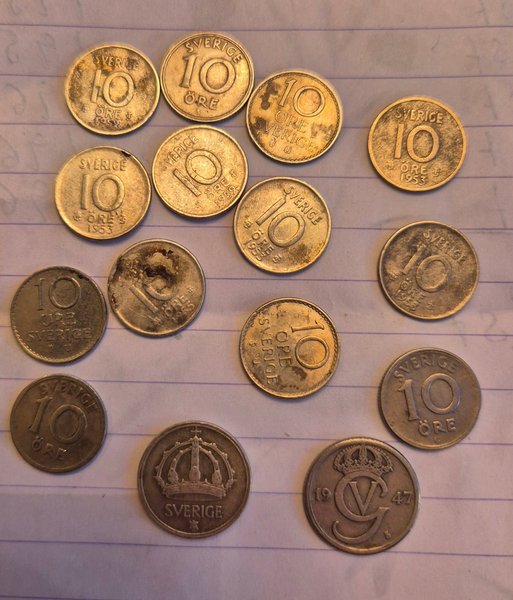 Parti med 15 svenska ören. Följande valörer och årtal ingår: 10 öre från 1953 (6 stycken), 10 öre från 1959 (2 stycken), 10 öre från 1952 (1 stycke), 10 öre från 1947 (1 stycke), 10 öre från 1955 (1 stycke), samt 4 stycken 10 öre utan tydligt årtal.