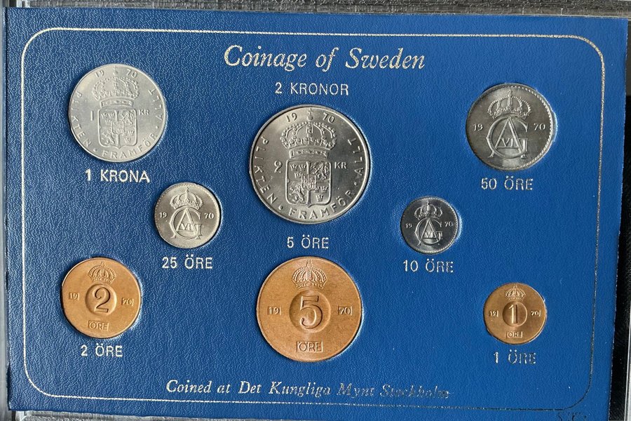Myntuppsättning från Sverige präglad 1970. Uppsättningen innehåller följande valörer: 1 öre, 2 öre, 5 öre, 10 öre, 25 öre, 50 öre, 1 krona och 2 kronor. Mynten präglades vid Kungliga Myntet i Stockholm.
