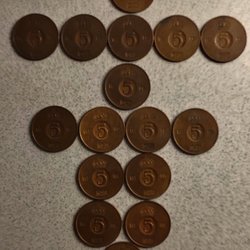 Tre svenska ören. En 10 öre från 1954, en 25 öre från 1956 och en 25 öre från 1940.