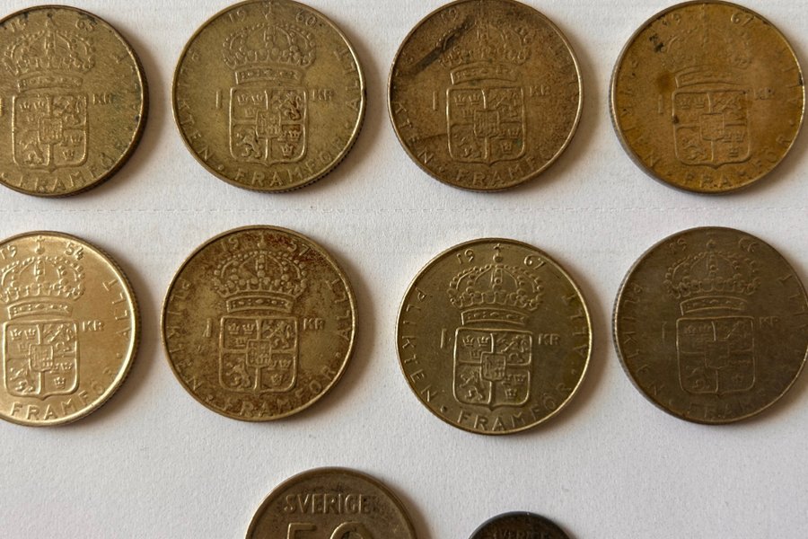 Parti med svenska mynt. Innehåller 50 öre från 1961, 10 öre från 1967, samt flera 1 kr-mynt från 1954, 1960, 1967 och 1969.