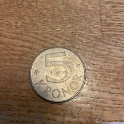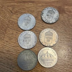 Fem svenska mynt. Ett mynt från 1982, två mynt från 1987, ett mynt från 1984 och ett mynt utan synligt årtal.