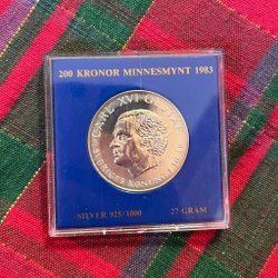 Minnesmynt från 1983 med ett värde av 100 kronor. Tillverkad av 925/1000 silver. Vikt 16 gram.