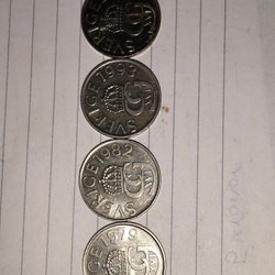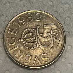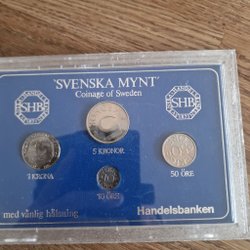 Svenska mynt från olika år. Bland annat 50 öre från 1955 och 1958, 1 krona från 1969, 5 öre från 1969, 1 krona från 1979, 50 öre från 1993.