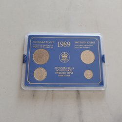 Detta set innehåller ocirkulerade svenska mynt från 1989, präglade och förpackade av AB Tumba Bruk Myntverket i Eskilstuna. Mynten är förseglade.