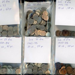 En samling svenska mynt. Innehåller 5-kronorsmynt från 1985, 1988, 1990, 1991, 1992, 1993, 1994, 1995, 1996, 1997, 1998, 1999, 2000, 2001, 2002, 2003, 2004, 2005, 2006, 2007, 2008, 2009, 2010, 2011, 2012, 2013, 2014, 2015, 2016, 2017, 2018, 2019, 2020, 2021, 2022, 2023. Även 1-kronorsmynt från 1976, 1977, 1978, 1979, 1980, 1981, 1982, 1983, 1984, 1985, 1986, 1987, 1988, 1989, 1990, 1991, 1992, 1993, 1994, 1995, 1996, 1997, 1998, 1999, 2000, 2001, 2002, 2003, 2004, 2005, 2006, 2007, 2008, 2009, 2010, 2011, 2012, 2013, 2014, 2015, 2016, 2017, 2018, 2019, 2020, 2021, 2022, 2023. Samt 50-öresmynt från 2009 och 10-kronorsmynt från 2016.