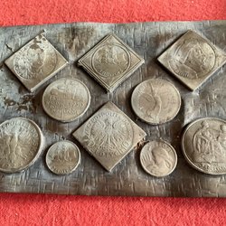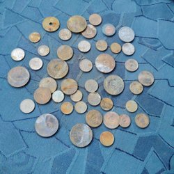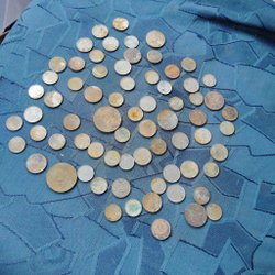 En samling av svenska 25 öre mynt från olika årtal: 1944, 1949, 1953, 2st.1954, 3st.1955, 1958, 1961, 1968 och 1973.