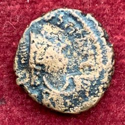 Detta antika mynt har en oregelbunden form och är präglad med otydliga symboler på båda sidor. Färgen är en blandning av koppar och grön patina.