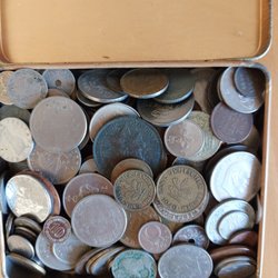 Ett parti med blandade mynt från olika länder och årtal. Innehåller bland annat svenska 50 öre från 1953, 5 öre från 1966, 2 öre från 1964, 1 öre från 1972, 25 öre, 10 öre, 5 öre, 2 öre, 1 öre. Finska 10 markkaa. Danska mynt med Frederik. Tyska mynt. Brittiska mynt med Elizabeth.
